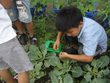 学年園で育てたキャベツ畑に、モンシロチョウの卵を探しに行きました。