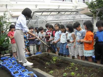 最後に、一人一鉢で育てたヒマワリの苗を学年園に植えかえました。