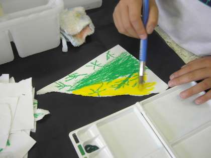 白い画用紙に白いクレパスで白い木を描いていた子は、絵の具をぬると思わず・・・「あっ!木がでてきた。きれい」
