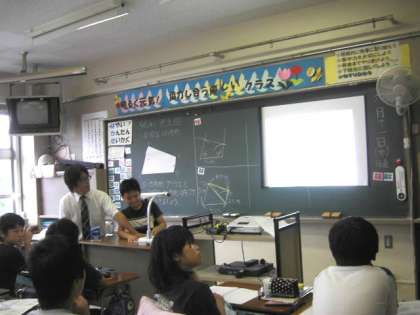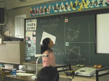次に、3人が黒板にかき、かき方を説明しました。その他に多くの挙手がありましたのでマグネットつきスクリーンにノートを写しだし、説明しました。