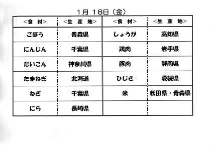 1月17日(木)の給食と18日(金)給食食材の産地について