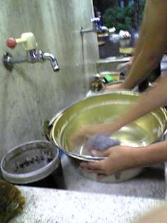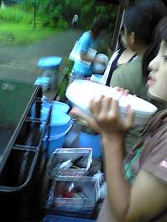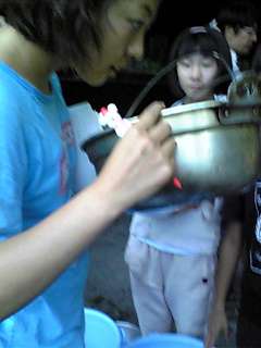 飯盒にカレ−なべ お皿にスブ−ン すべて ピカピカになるまでに1時間以上かかりました。全部の班が合格したのは6時15分を過ぎていました。