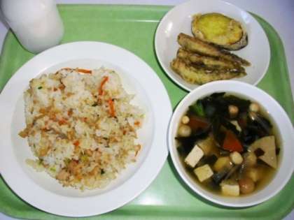28日(月)の主菜は、さつまいもとニギスの天ぷらでした。ニギスは白身のくせのない小魚で、頭もとってあるので食べやすいかなと思いましたが、やはり低学年の中には小魚を苦手とする児童もいたようです。