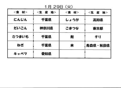 1月28日(月)の給食と29日(火)給食食材の産地について