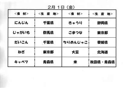 1月31日(木)の給食と2月1日(金)給食食材の産地について