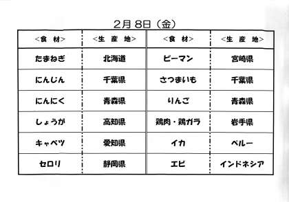 2月7日(木)の給食と8日(金)給食食材の産地について