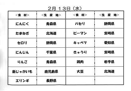 2月12日(火)の給食と13日(水)給食食材の産地について
