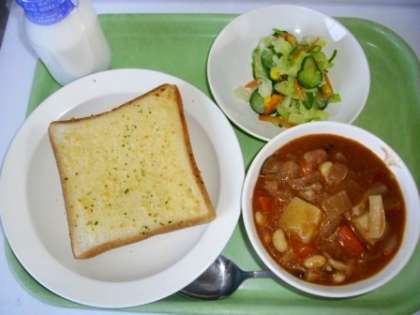 13日(水)は、定番の人気メニュー「ガーリックトースト」、旬の新じゃがいもを使った「新じゃがとお豆のシチュー」、「イタリアンサラダ」というメニューでした。新じゃがをたっぷり使いすぎて、シチューのできあがり量がいつもの1.2倍ぐらいになってしまいましたが、残りはそれほど多くなく、よく食べてくれていました。