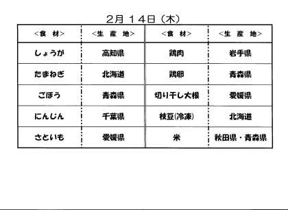 2月13日(水)の給食と14日(木)給食食材の産地について