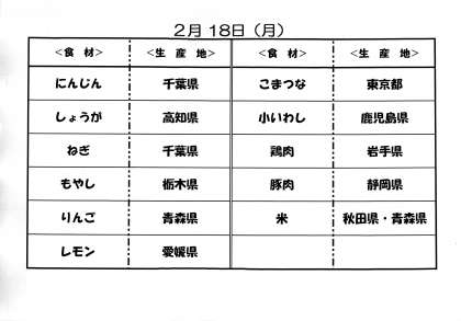 2月15日(金)の給食と18日(月)給食食材の産地について