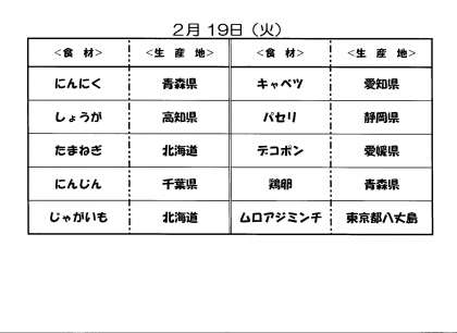 2月18日(月)の給食と19日(火)給食食材の産地について