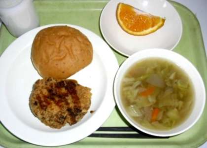 19日(火)の給食では、東京都八丈島で水揚げされたムロアジのミンチを使って、メンチカツを作りました。子どもたちは自分でパンにはさんで、「メンチカツバーガー」として食べました。お魚が苦手な子どもにも、おいしく食べられたようです。
