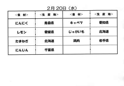 2月19日(火)の給食と20日(水)給食食材の産地について