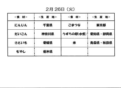 3月26日(火)の給食と27日(水)給食食材の産地について