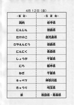 4月12日(金)の献立は、たけのこごはん、トビウオの棒餃子、わかめサラダです。主な食材の産地は以下の通りです。