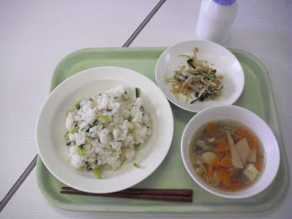5月10日(金)の青菜とじゃこのごはんは、じゃこを油で炒めてから混ぜ、香ばしさを感じられるようにしました。
