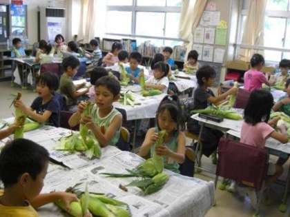 『トウモロコシの皮をむくのは始めて』という子ども達も多く、皮の中から出てきた見慣れた姿のトウモロコシに『わぁ〜!』という歓声があがっていました。