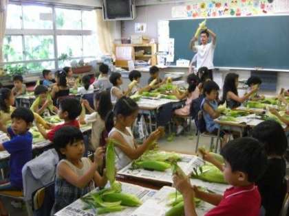 今日の給食に使うトウモロコシの皮を2年生にむいてもらいました。
