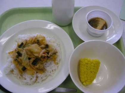 今日の献立は「キムチ丼、牛乳、蒸しトウモロコシ、黒みつ寒天」でした。