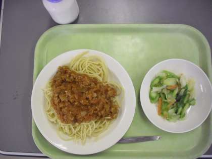 6月6日(木)のミートソースは、たけのこのみじん切りを入れることにより、食感にアクセントを加えました。