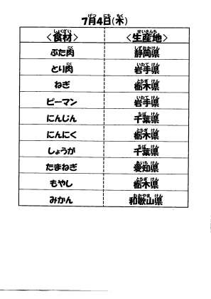 7月4日(木)の献立は、肉みそうどん、もやしとわかめのサラダ、くだもの(冷凍みかん)、牛乳です。食材の産地は以下の通りです。