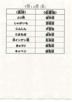 7月10日(水)の献立食材の産地について