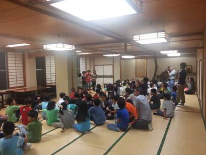 残念ながら雨がやまず、屋内レクに変更して実施します。レク係さんの打ち合わせも十分楽しめました。