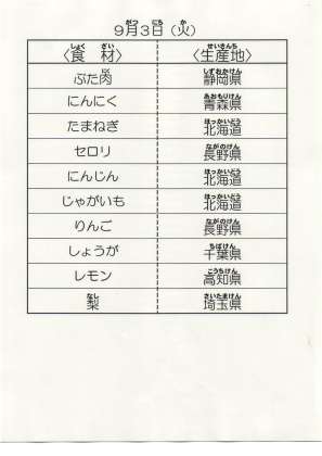9月3日(火)の献立は、カレーライス、にんじんサラダ、くだもの(梨)、牛乳です。今日から2学期の給食が始まります。
