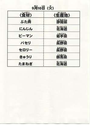 9月10日(火)の献立は、スパゲティミートソース、ビーンズサラダ、ぶどうゼリー、牛乳です。