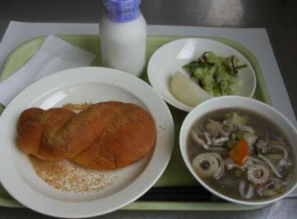 「きなこ揚げパンシナモン風味、牛乳、あんかけ汁、キャベツの塩昆布かけ、なし」でした。