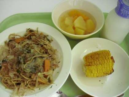 <献立>ソース焼きそば、牛乳、焼きトウモロコシ、フルーツポンチ
