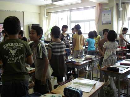 外国語活動は、「外国語を通じて、言語や文化について体験的に理解を深め、積極的にコミュニケーションを図ろうとする態度の育成を図り、外国語の音声や基本的な表現に慣れ親しませながら、コミュニケーション能力の素地を養う。」を目標としています。