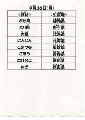9月30日(月)の献立は、豚肉とごぼうのごはん、吉野汁、ぶどう豆、牛乳です。