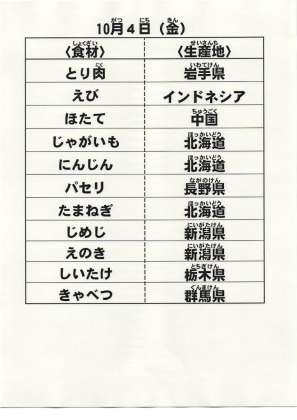 10月4日(金)の献立食材の産地について