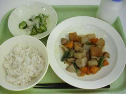 <献立>ごはん、牛乳、筑前煮、野菜のゆかりかけ