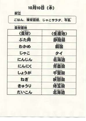10月10日(木)の献立と食材の産地は以下の通りです。