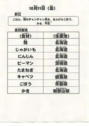 10月11日(金)の献立と食材の産地は以下の通りです。