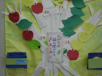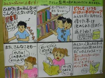読み聞かせの足跡も図書室利用上の注意もすべて、手作りです。