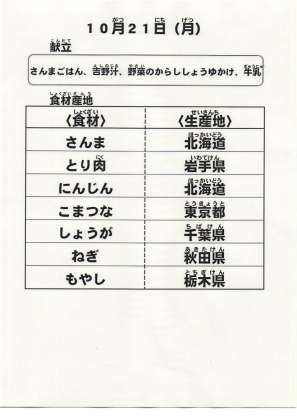 10月21日(月)の献立と食材の産地は以下の通りです。