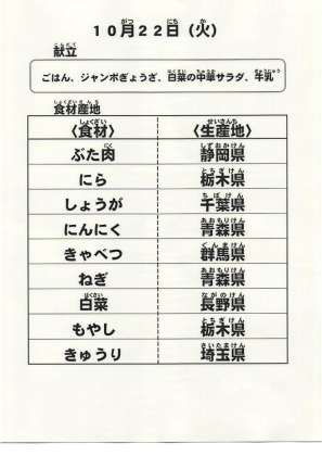 10月22日(火)の献立と食材の産地は以下の通りです。