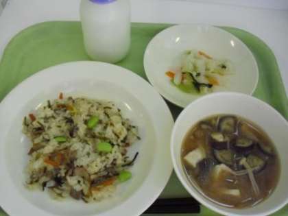 <献立>豚肉とごぼうのごはん、牛乳、みそ汁、野菜の甘酢かけ