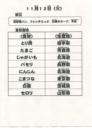 11月12日(火)の献立と食材の産地は以下の通りです。