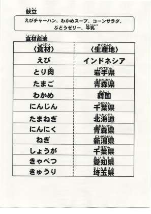 11月26日(火)の献立と食材の産地は以下の通りです。