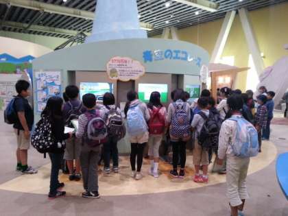 お菓子工場の見学、昼食が終わり、環境エネルギー館の見学中です。楽しそうに学習しています。