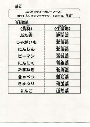 11月27日(水)の献立と食材の産地は以下の通りです。