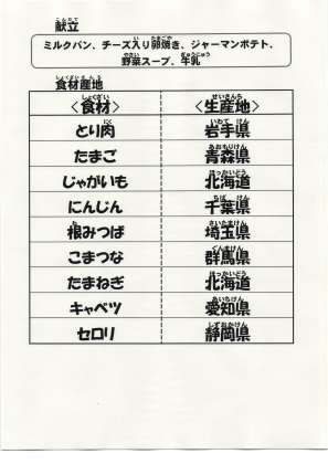 12月3日(火)の献立と食材の産地は以下の通りです。