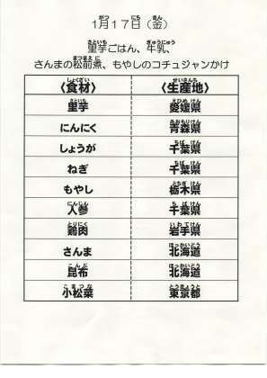 1月17日(金)の献立と食材の産地は以下の通りです。