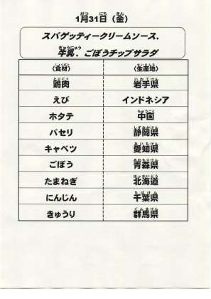 1月31日(金)の献立と食材の産地は以下の通りです。