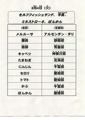 2月4日(火)の献立と食材の産地は以下の通りです。