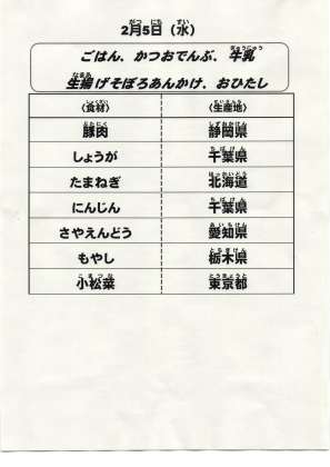 2月5日(水)の献立と食材の産地は以下の通りです。